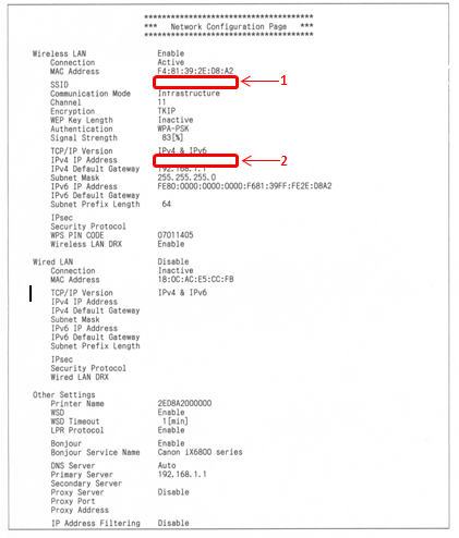 You network name (or SSID) should be displayed in box 1 and your printer should obtain an IP address displayed in box 2.