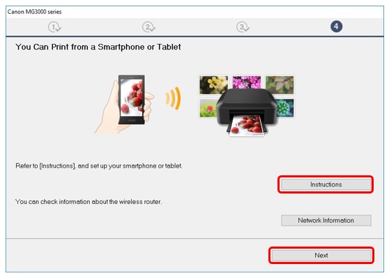 26. Once the additional software has installed, you will see a message informing you about setting up your smartphone or tablet. Click [Instructions] to find out more information on setting up your device, or click [Next] to continue.
