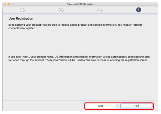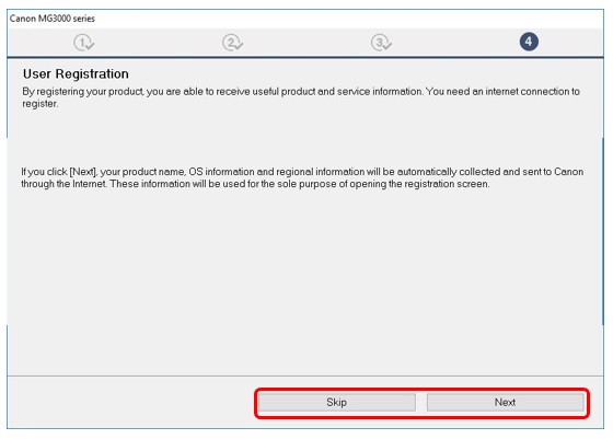27. To register your printer, click [Next] (this will open in a web browser). Alternatively, click [Skip].