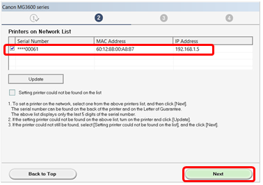 13. If you have already connected your printer to your network, select it from the list within the “Printers on the Network List” window and click [Next] to start the software installation, then proceed to step 20.