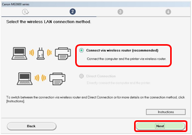 8. Select [Connect via wireless router (recommended)], then click [Next].
