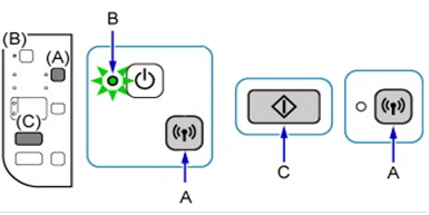 3. Press [Black] button (C) and then the [Wi-Fi] button (A); make sure the Wi-Fi lamp (D) flashes quickly and the ON lamp is lit as shown in illustration below. Then then go to your access point and press the [WPS] button within 2 minutes.