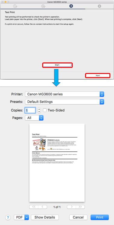 28. To perform a test print to confirm installation, click [Start] otherwise click [Next].