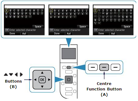 ] buttons (B) to select a character from the keyboard, then press the [OK] button to select and move to the next character.