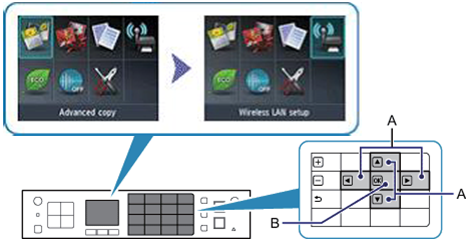 ] buttons (A) to navigate to the [Wireless LAN Setup] or [WLAN Setup] icon and press the [OK] button (B).