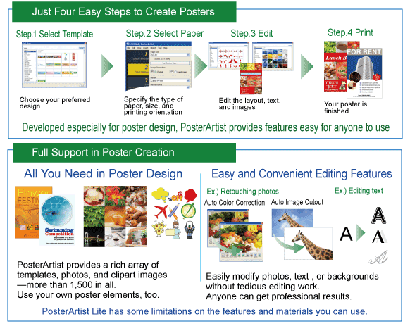 PosterArtist comes with 200 pre-designed templates, over 1,000 royalty free images and clipart, over 150 backgrounds, over 150 frames, a variety of text graphics and much more to make creating professional looking posters quick and easy.